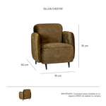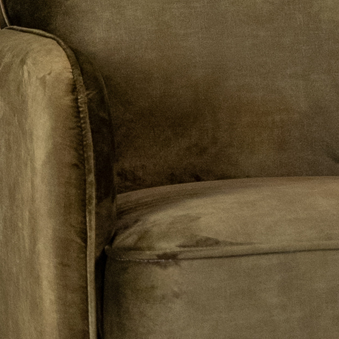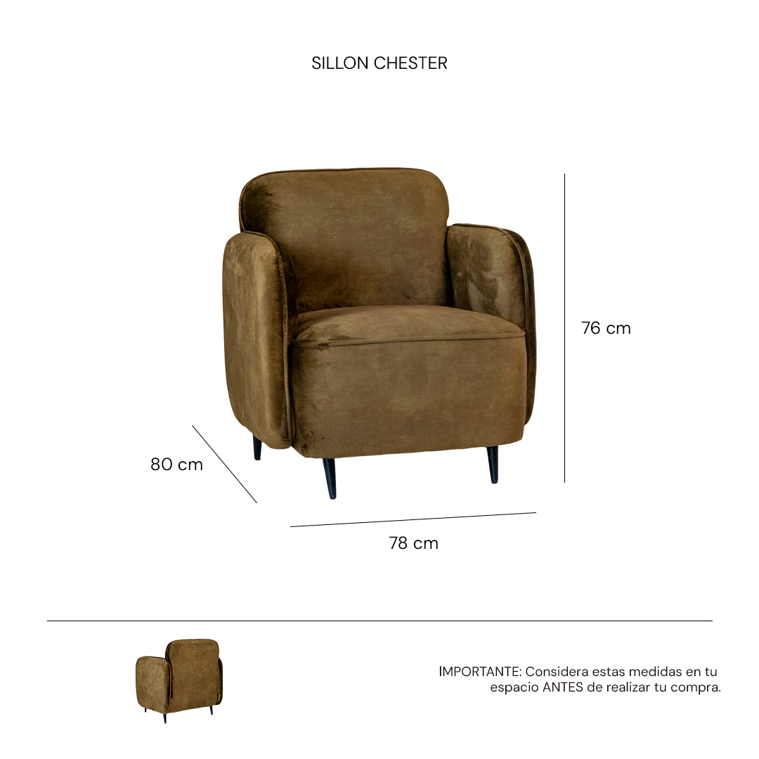 El sillón individual Chesters presenta un diseño contemporáneo de líneas redondeadas que envuelven el cuerpo con suavidad. Su tapizado en tela tipo velvet color moss ofrece una textura cálida y elegante, con un tacto suave que mantiene su apariencia gracias a su alta resistencia a la abrasión y al uso diario.