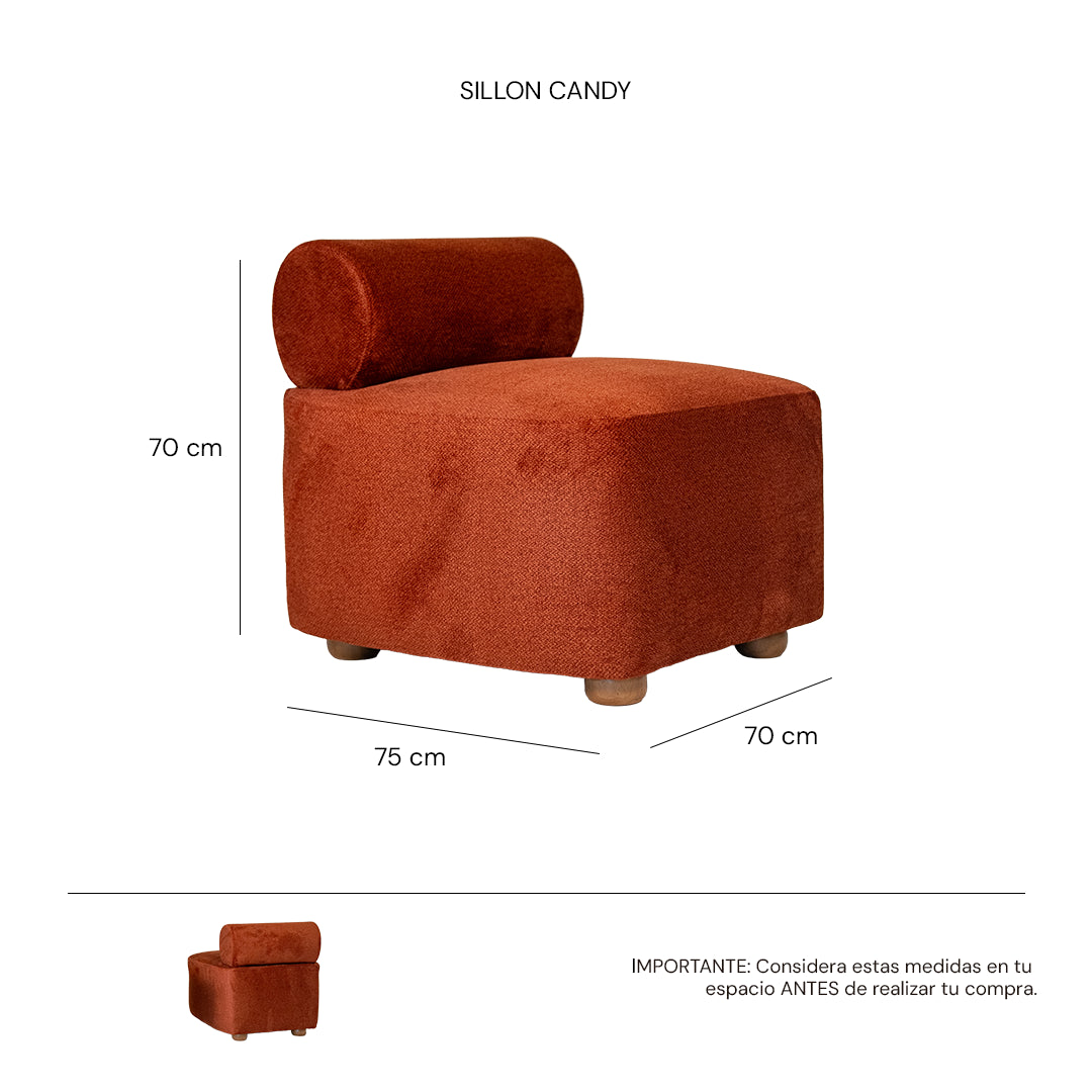 El sillón individual Candy combina un diseño compacto y curvas suaves con un respaldo cilíndrico cómodo y un tapizado resistente de gran suavidad. Sus patas circulares en tono nogal complementan su estilo contemporáneo, haciéndolo perfecto para salas, recámaras y rincones de lectura. Gracias a sus proporciones equilibradas, se integra fácilmente tanto en espacios amplios como en ambientes más reducidos.